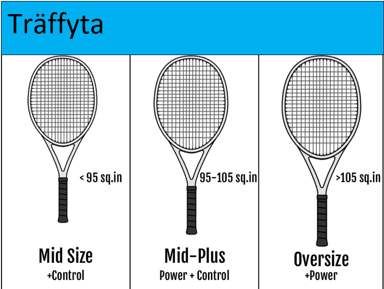 Oversize racketar anses vara över 105 ”square inches”. Mid-plus är racket som sträcker sig från 95-105 quare inches och mellanstora racketar är mindre än 96 square inches.