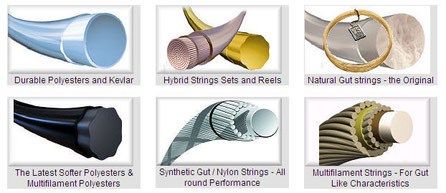 Exempel: TOA Leoina 66, Wilson Championship Nylon, Babolat Powergy, och Prince turnering nylon.