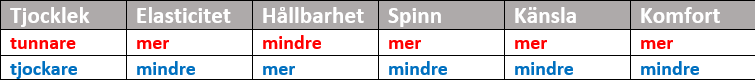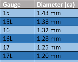 Ofta anges en senas tjocklek med ”gauge”. Följande tabell hjälper dig att konvertera mellan gauge och milimeter.